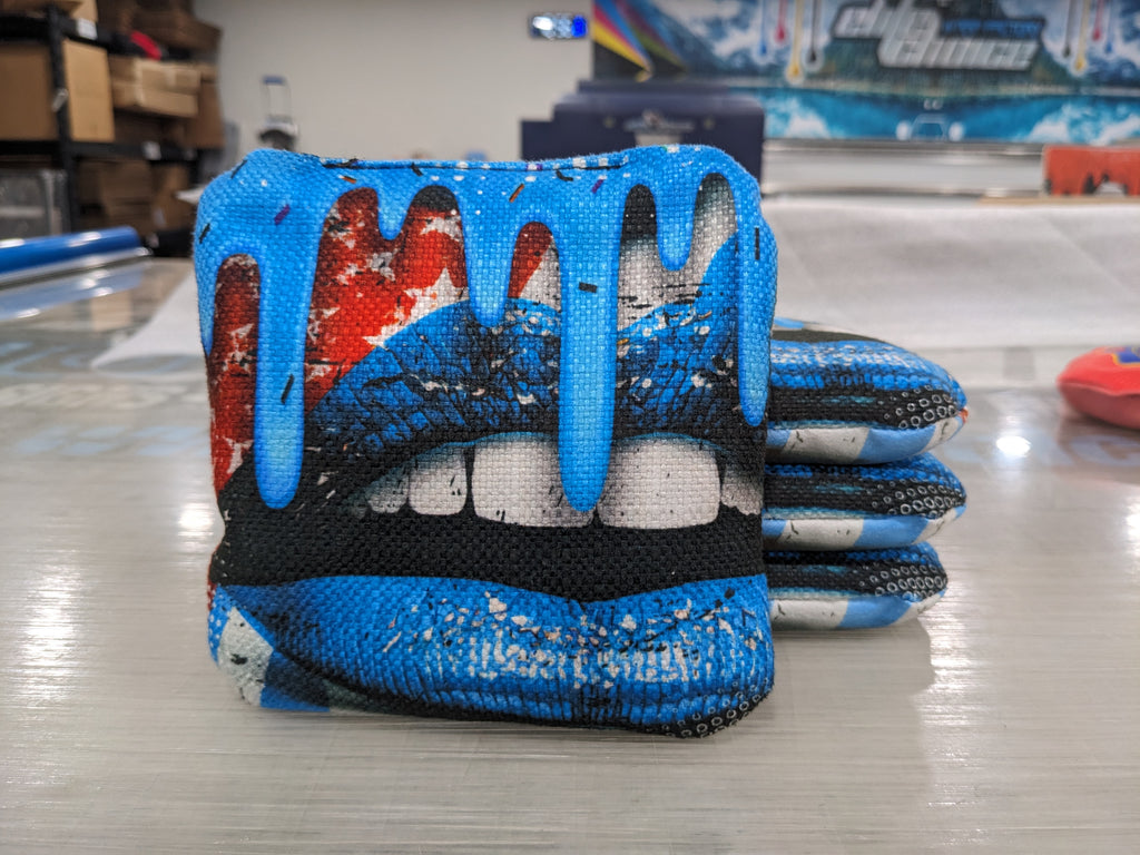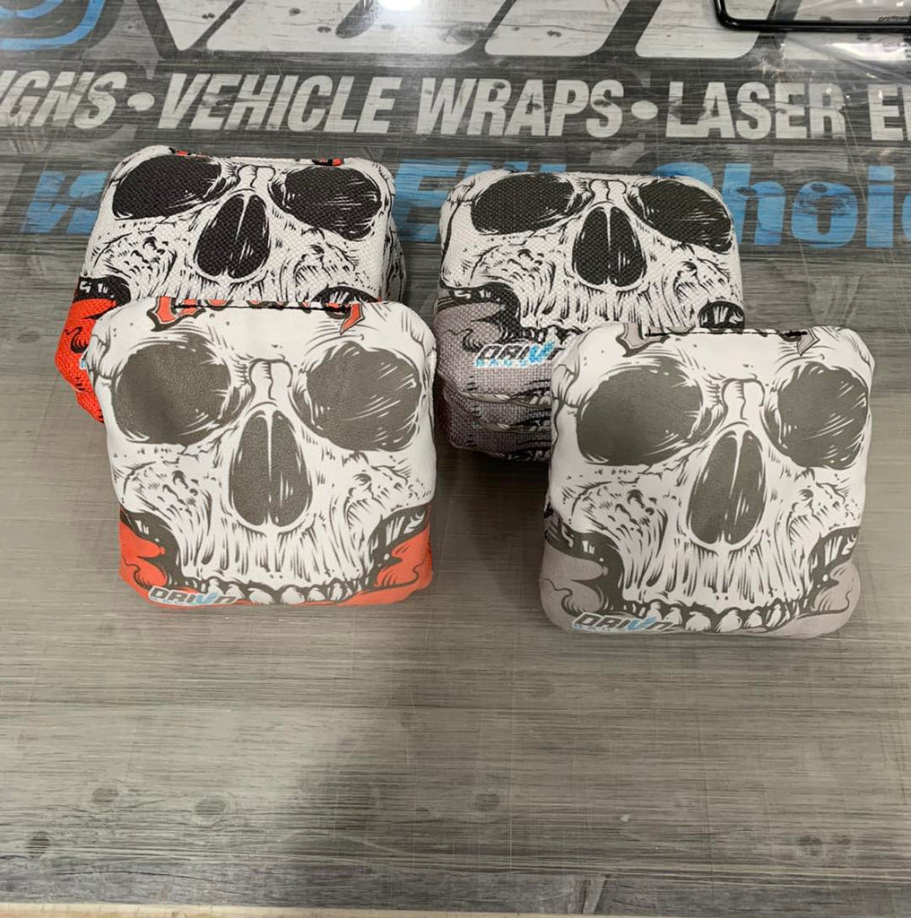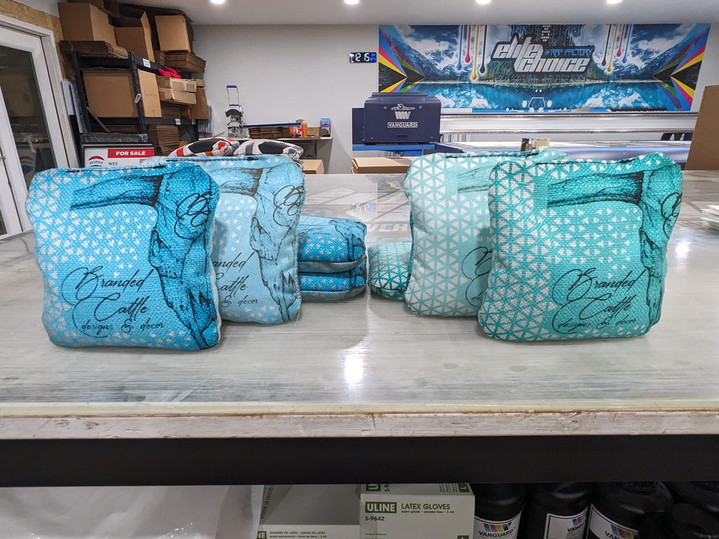 You will receive profession grade, custom bags with custom artwork. These bags feature a suede "stick" side and a faster "slick" side for strategic game play. We use a poly-resin filled to make your custom,tournament style set of bags. Your approved artwork sent to you from our design team and our cutting edge equipment will be a dynamic due paired for an awesome set of custom bags!